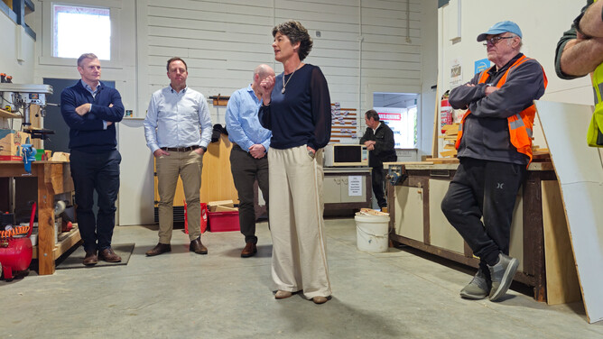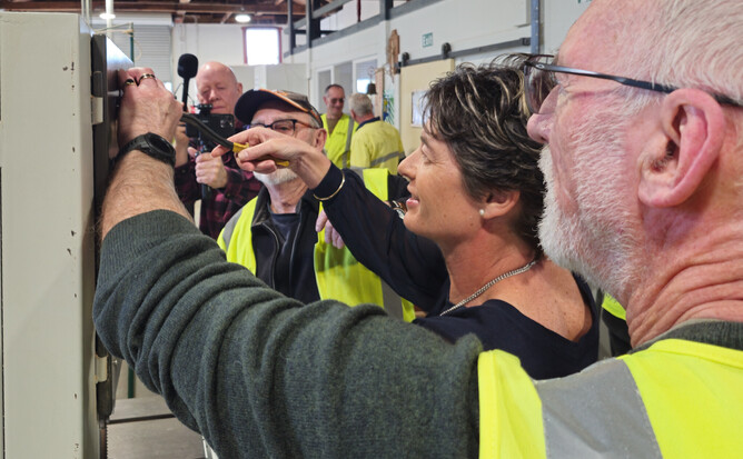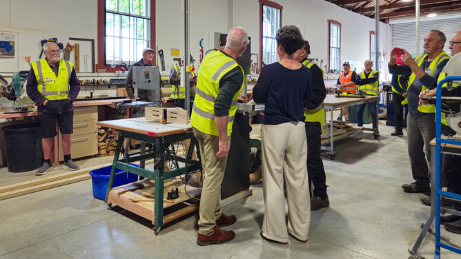 Michelle Roley and others from Forsyth Barr Cambridge were at the Shed at 9.30am on the 15th October for an official plaque attachment ceremony…..they gave us the funds ($1,700) to cover the full purchase cost of our new bandsaw and in return we will put a name plaque on the machine commemorating the fact that they have kindly donated the machine.