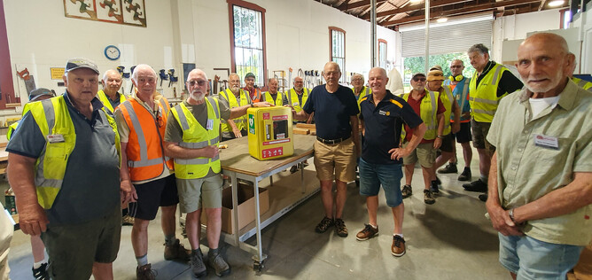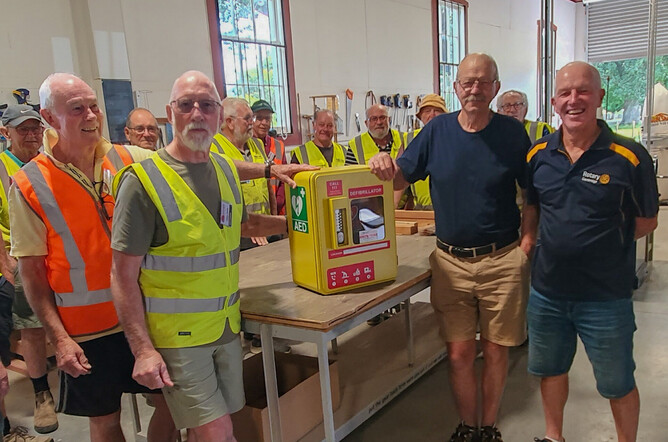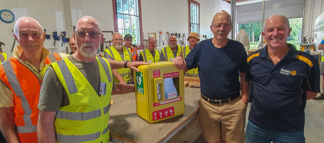 The Rotary Club of Cambridge has presented the Menzshed with an Automatic Emergency Defibrulation device to be installed as soon as a location is agreed with Waipa DC. It was presented at a gathering on Monday by Rotary President Laurie Graham and Past District Governor Bill Robinson.